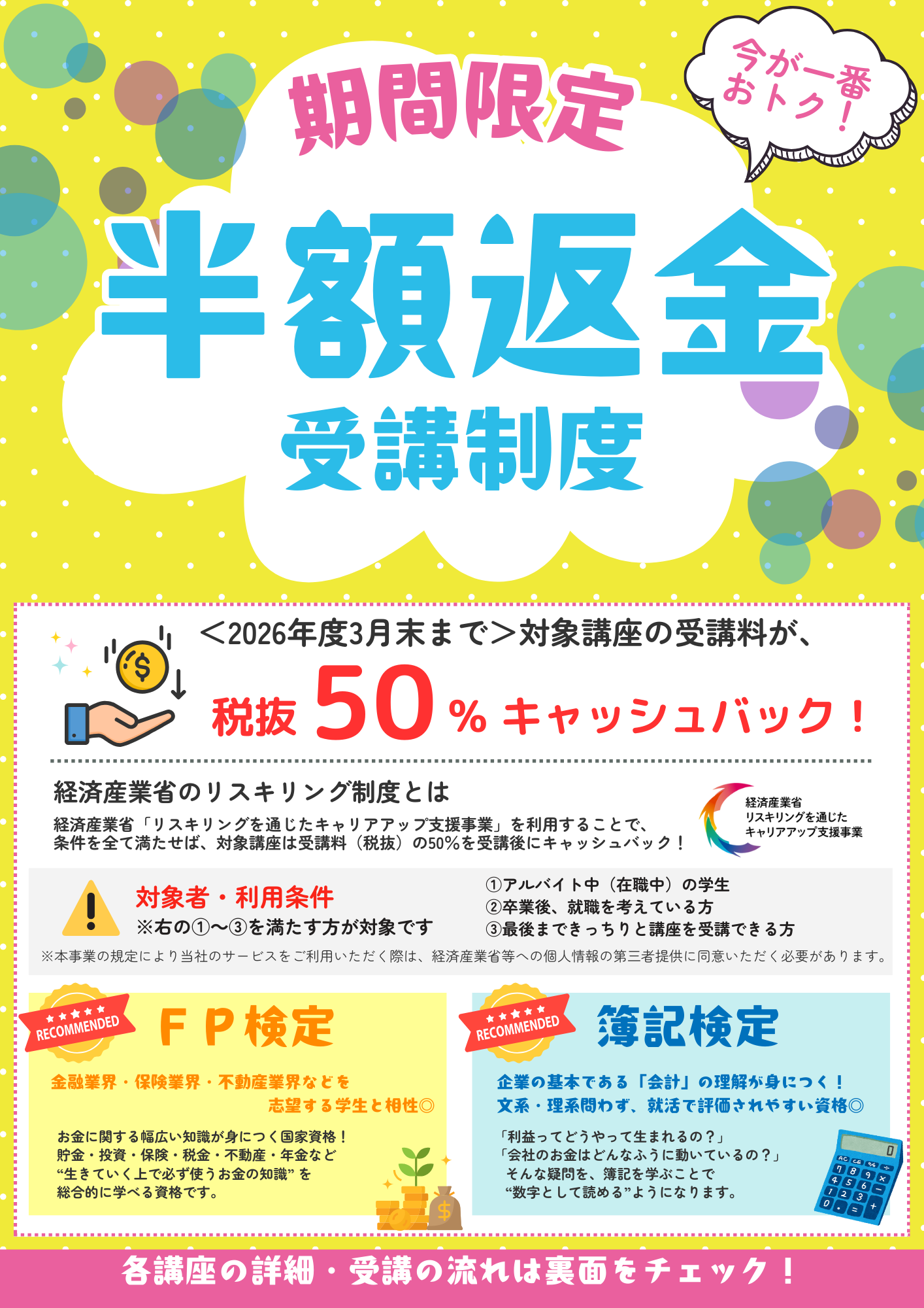 一部講座については、受講後に受講料50%相当額が返還されます。