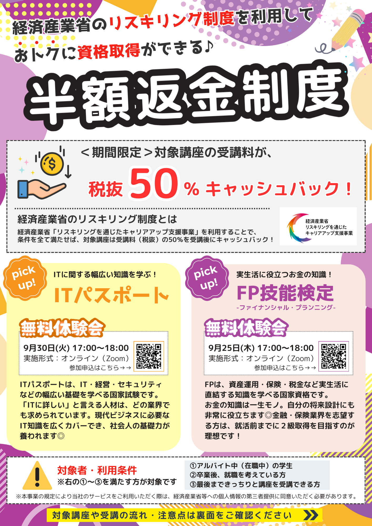 利用条件を満たせば、受講後に受講料(税抜)の50%をキャッシュバック!
